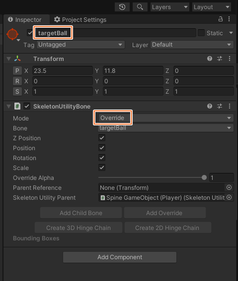 그리고 나서 Aim 용 IK(위 캡쳐에선 이름이 targetBall이다) 를 선택한 후 Inspector창을 보면 Default로 SkeletonUtilityBone의 Mode가 Follow로 되어있는데 이걸 Override로 바꿔준다.