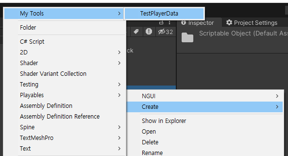 이 클래스를 프로젝트에 추가하면, 유니티의 에셋 메뉴에 Tools>TestPlayerData 라는 경로로 새로운 TestPlayerData 인스턴스를 생성할 수 있는 옵션이 생깁니다. 이 기능을 사용하면 게임 내에서 사용할 다양한 플레이어 데이터를 쉽게 관리할 수 있습니다.