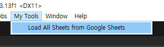 이 스크립트는 My Tools메뉴 아래에 Load All Sheets from Google Sheets라는 새로운 메뉴 항목을 추가합니다. 이 메뉴 항목을 클릭하면 LoadFromGoogleSheets 메서드가 실행되어 Google Sheets에서 데이터를 불러오는 작업을 수행할 수 있습니다.