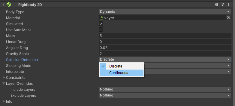 - 제한사항: 더 많은 계산을 요구하기 때문에, Continuous 모드는 Discrete 모드에 비해 성능에 더 큰 영향을 줄 수 있습니다. 따라서 필요한 오브젝트에만 이 모드를 사용하는 것이 좋습니다.
