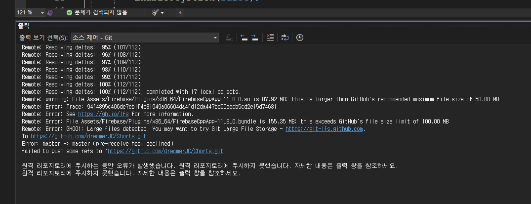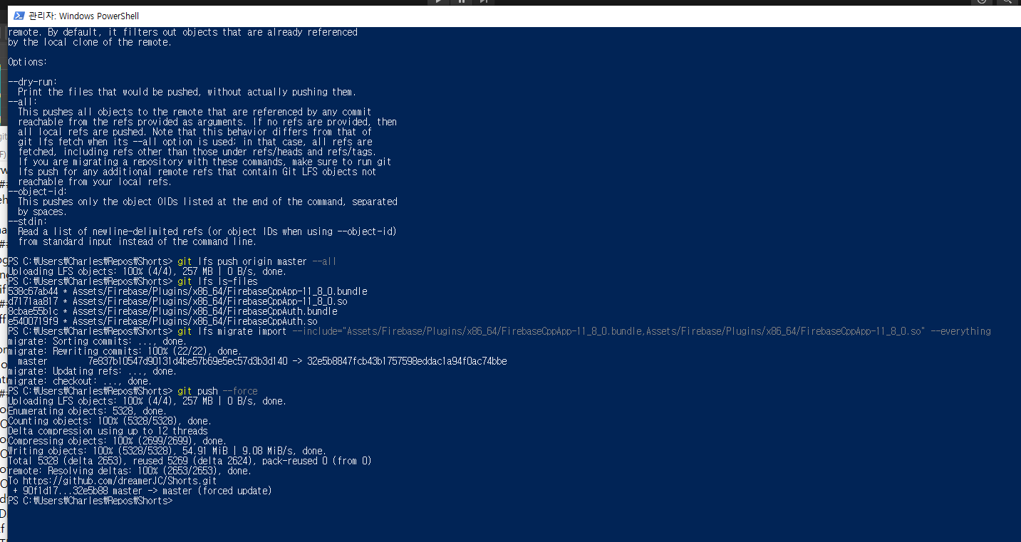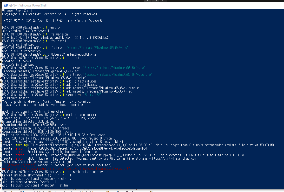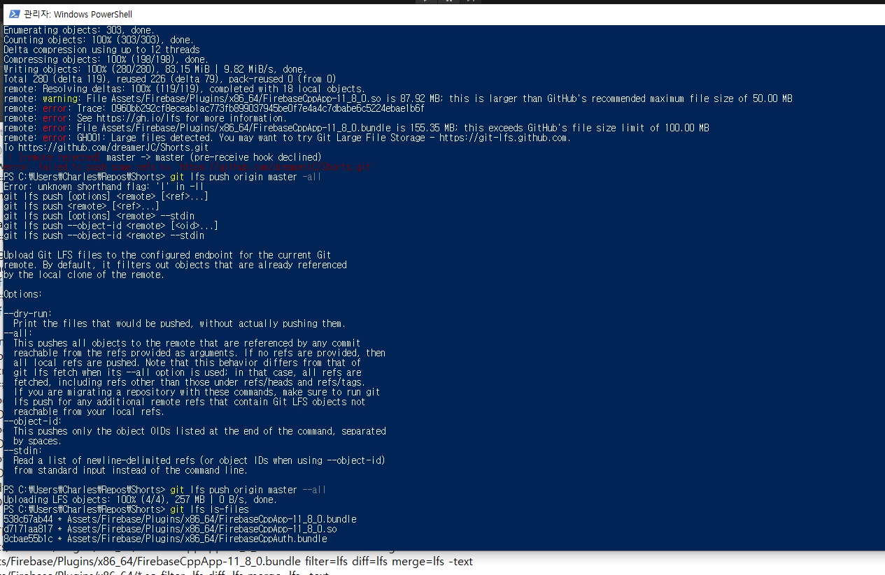 유니티 게임 제작 시 Firebase를 사용해야 할 때 Github LFS를 사용해야 할 상황이 생기는데(Auth 관련 SDK Package 를 설치하면 2개의 파일의 용량이 90mb, 160mb 임) LFS 설치 및 설정을 했음에도 원격 리포지토리에 푸시하지 못했다고 에러가 뜰 때.