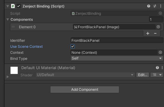 해당 게임오브젝트에 Add Component 버튼을 클릭하여 ZenjectBinding 컴포넌트를 추가 후, Components 에 해당 Image 컴포넌트를 바인딩 시켜준다. 그래고 Identifier 를 자기가 원하는 문자열로 지정해준다. 필자의 경우 FrontBlackPanel 이라고 지정했다. Use Scene Context를 체크하면 해당 씬의 씬콘텍스트를 사용하겠다는 의미이고, 체크를 해제한 후 Context 옵션에 원하는 콘텍스트를 바인딩하면 된다.