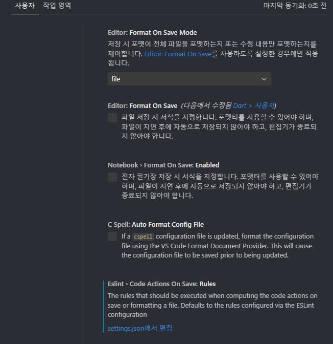 위 스샷 맨 아래 보이는 settings.json에서 편집을 클릭해서 아래 두 줄을 추가해도 된다.