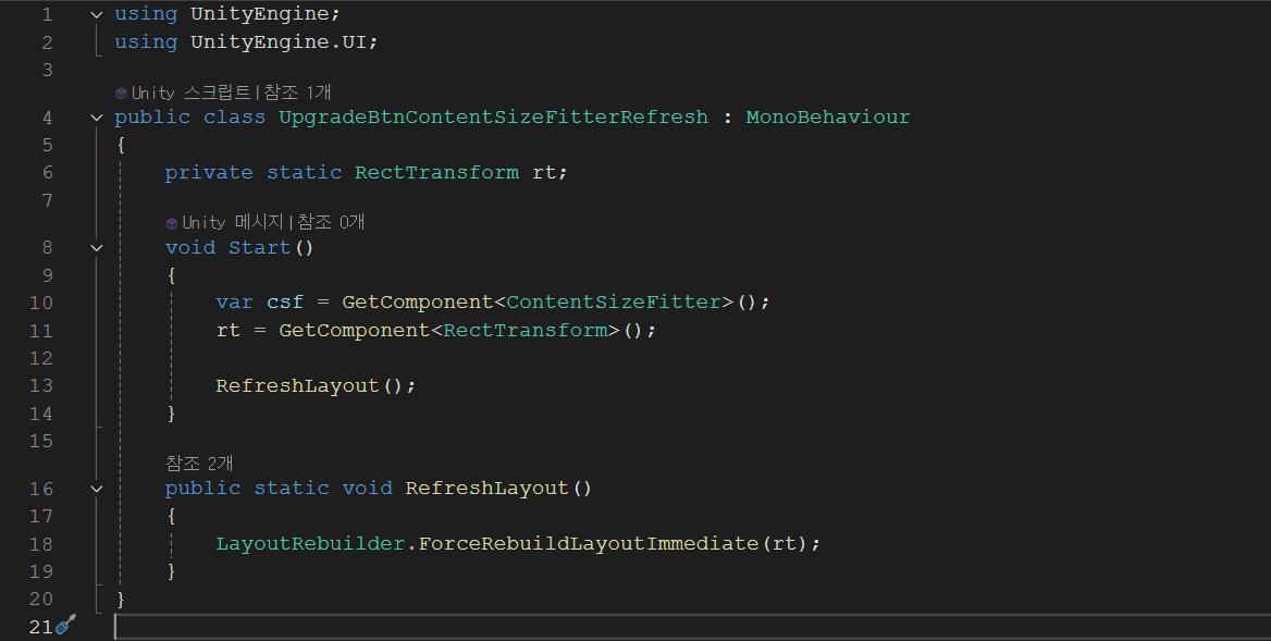 Unity에서 ContentSizeFitter가 하위 텍스트의 크기 변경 시 부모 오브젝트의 크기를 즉시 갱신하지 않는 문제를 해결하려면, 레이아웃을 강제로 새로 고치는 코드를 사용할 수 있습니다. 아래는 이를 구현하는 코드 예제입니다.