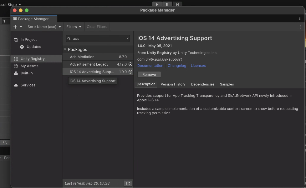 iOS빌드할 때 네임스페이스 없다는 에러가 뜨는데 Package Manager에서 Unity REgistry > iOS 14 Advertising Support 를 설치해야 에러가 사라짐